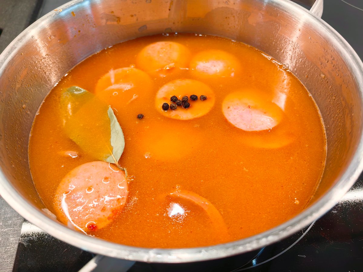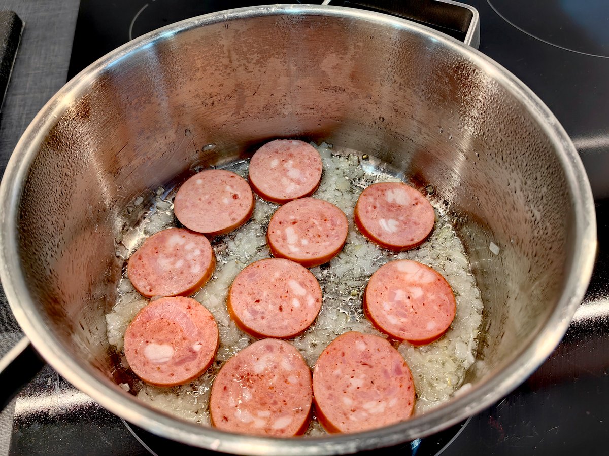 Ko čebula postekleni, v kozico dodamo česen in narezano klobaso, ki jo na obeh straneh popečemo.