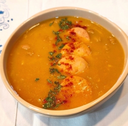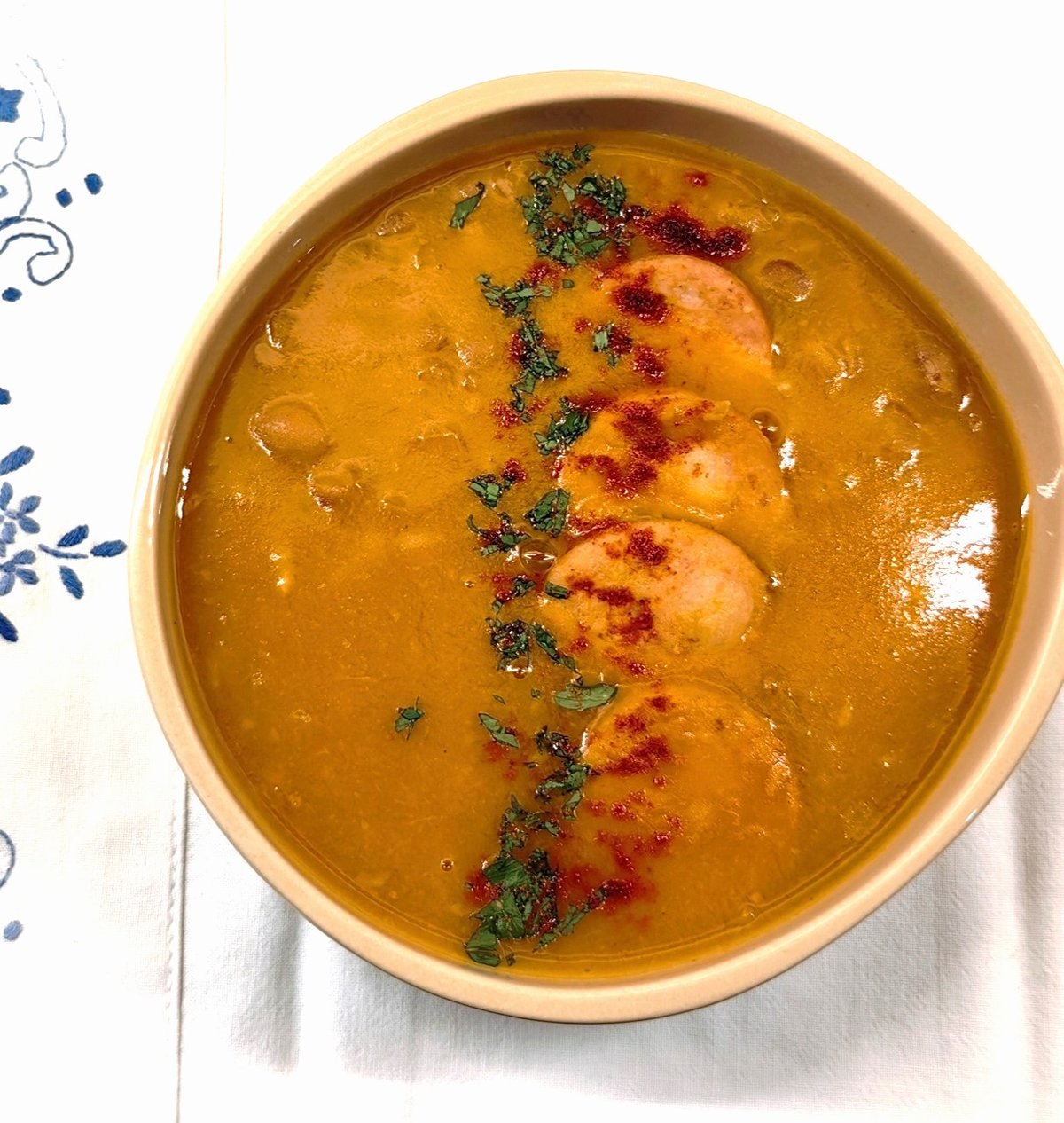 PostopekČebulo in česen olupimo ter ju drobno nasekljamo. Klobaso olupimo in narežemo na kolobarje.