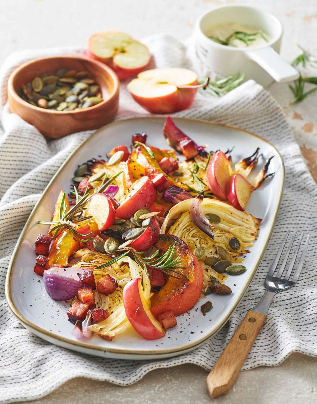 1 majhna glava belega zelja 1 buča hokaido 2 rdeči čebuli 2 rdeči jabolki 100 ml oljčnega olja sol mlet črni poper vejica rožmarina 200 g slanine