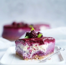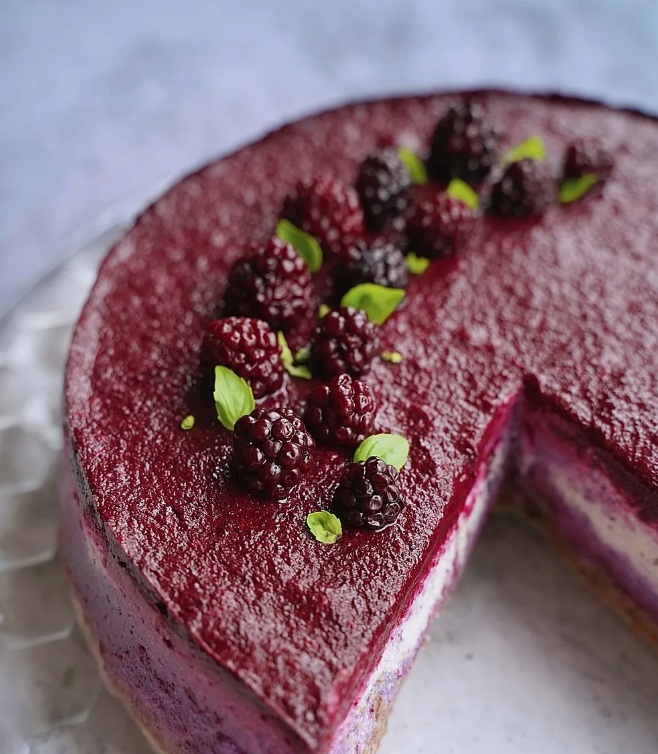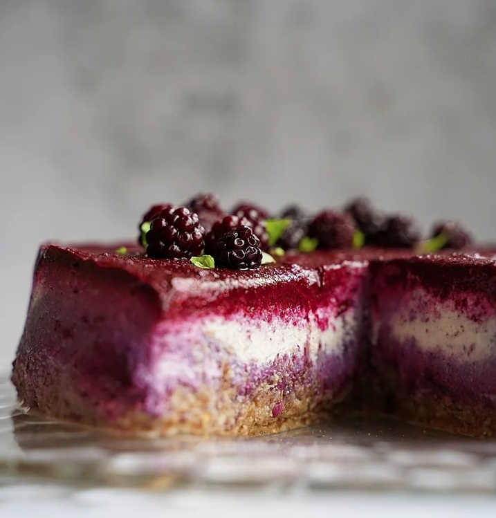 3. Za kremo indijske oreščke noč prej namočimo v zadostni količini hladne vode. Naslednji dan jih odcedimo in speremo pod tekočo vodo. V mešalniku jih z 1 dcl vode zmiksamo v gladko pasto. Damo jih v posodo, dodamo kokosovo smetano (strjeno kremo na vrhu ohlajene pločevinke kokosovega mleka) in zmešamo. Dodamo še sladilo po izbiri in stopljeno kokosovo olje. Na koncu v maso narahlo vmešamo še tretjino robidove marmelade in prelijemo po tortni podlagi. Za nekaj časa jo postavimo v zamrzovalnik, da se strdi. Ko je dovolj trda, čeznjo prelijemo še zadnjo tretjino robidove marmelade.
