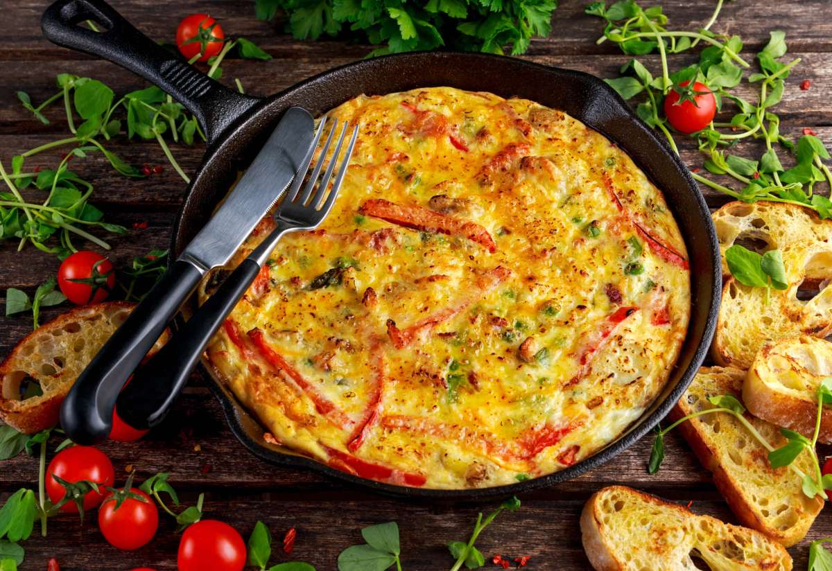 2. Razžvrkljamo jajca in jih zlijemo čez popraženo zelenjavo. Plamen znižamo in pokrijemo ponev s pokrovko. Če obvladate umetnost obračanja omlete, jo po minutki ali dveh obrnite in zapecite še z druge strani, sicer pa potrpežljivo počakajte še kakšno minutko, da jajca zakrknejo, nato posujte s parmezanom, pokrijte s pokrovko in odstavite z ognja.