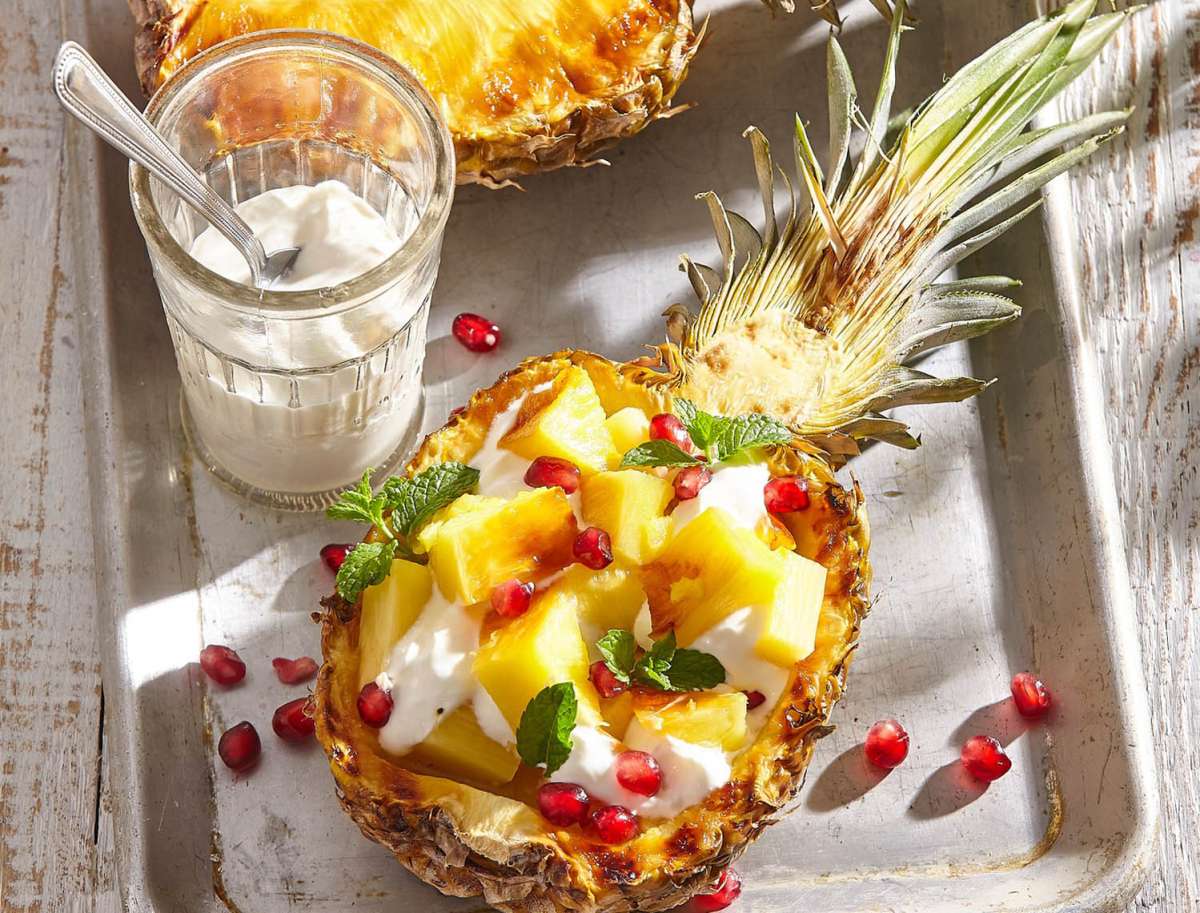 3. Z žlico izdolbite ananas, ga narežite na kocke in kocke vrnite v izdolbeno lupino.