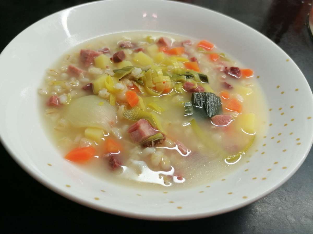 100 g ješprenja 100 g slanine, narezane na kocke 100 g prekajene svinjine, narezane na kocke 1 steblo zelene, narezano na majhne kocke 1 krompir, prav tako narezan na majhne kocke 1 por, narezan na kolute 1 majhna čebula sol