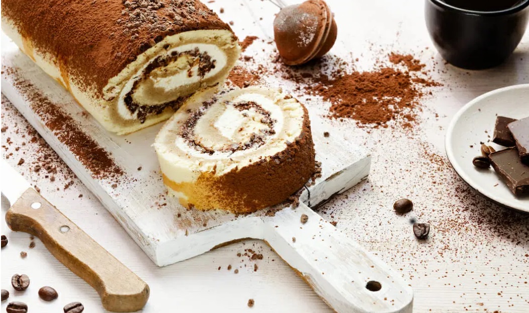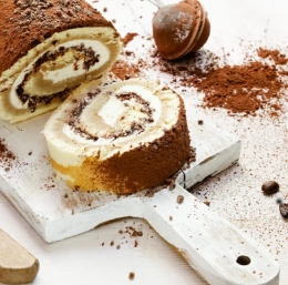 1 Biskvit nežno odvijemo in ga s pomočjo čopiča navlažimo s kavno raztopino. Posipamo s kakavom v prahu.