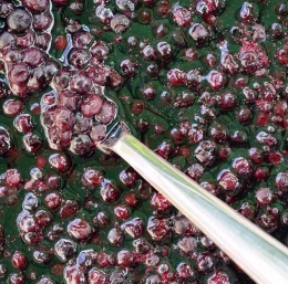 2 Zmes nato precedimo skozi cedilo, nato pa še dvakrat skozi vedno gostejšo tkanino, kot je prepognjena gaza. Ostanek popolnoma ožamemo, ostanke borovnic pa zavržemo.