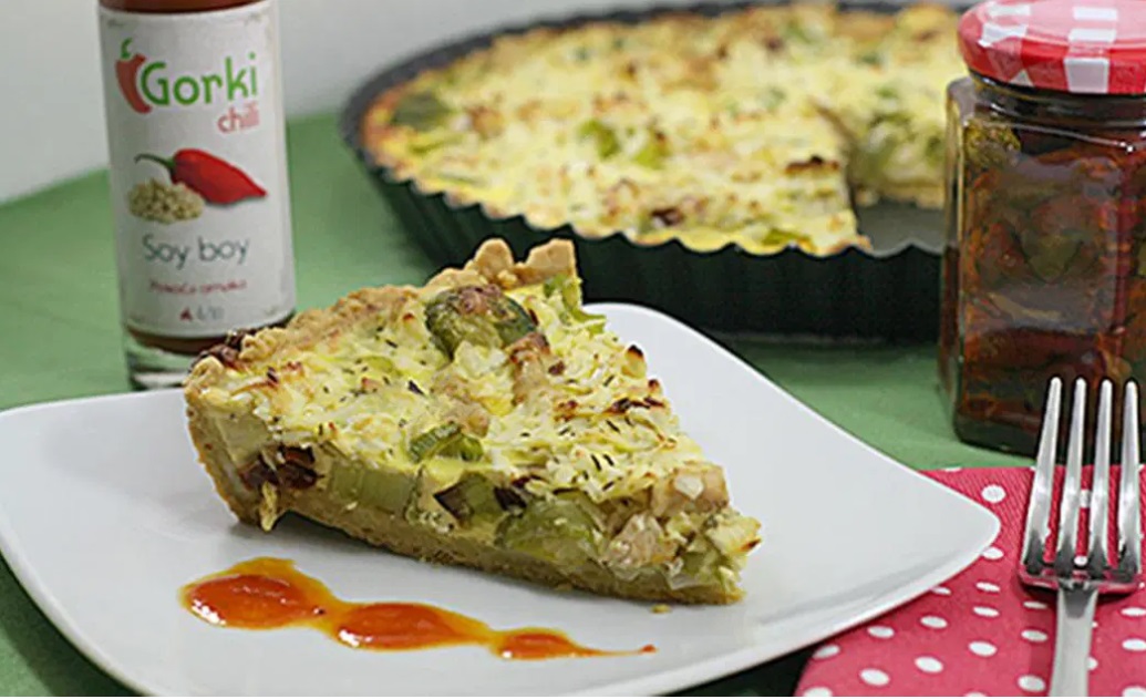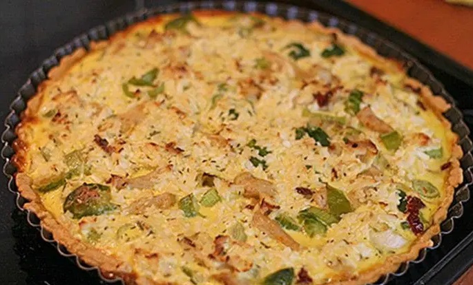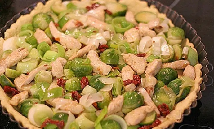 3 Medtem ko se testo peče, pripravimo nadev. Piščančje prsi narežemo na manjše kose, por na kolobarje, paradižnik na trakce in česen sesekljamo. Brstični ohrovt vržemo za pet minut v krop. Vse skupaj damo v ponev in na oljčnem olju malo popražimo. Nadev nato enakomerno porazdelimo čez pečeno pito, posolimo, popopramo. Sestavine za polivko zmešamo skupaj, razžvrkljamo in z njo prelijemo pito. Čez položimo par koščkov masla in jed položimo v pečico.
