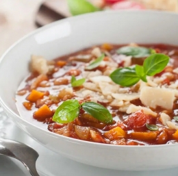 4 Dodamo na kockice narezan krompir in vse skupaj pokrito kuhamo še 15 minut. Nato dodamo testenine, stročji fižol, grah, ohrovt in nasekljan peteršilj. Pokrito počasi kuhamo 15 minut, da je zelen kuhana. Kuhano juho začinimo s soljo in poprom, ponudimo pa jo z grobo nastrganim parmezanom.