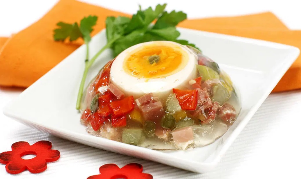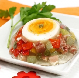 50 g želatine za aspik 2 žlici limoninega soka sol 150 g korenja 1 čebula 5 jajc 200 g kuhane šunke 100 g graha 1 steblo zelene 1 rdeča paprika za slanico