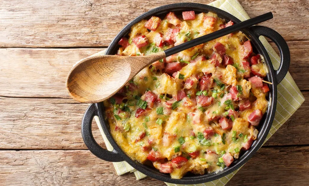3 Pekač dobro namastimo in vanj enakomerno razporedimo kruh. Enakomerno razporedimo tudi šunko in sir. Prelijemo z jajci in premešamo.