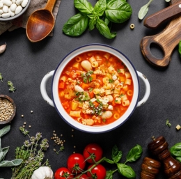 5. Zmešamo ves fižol, testenine, čebulo in paradižnikovo omako. Kuhamo še kratek čas, da se testenine ujamejo z juho, in po okusu še dodamo začimbe. Večkrat premešamo po dnu.