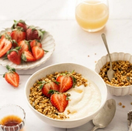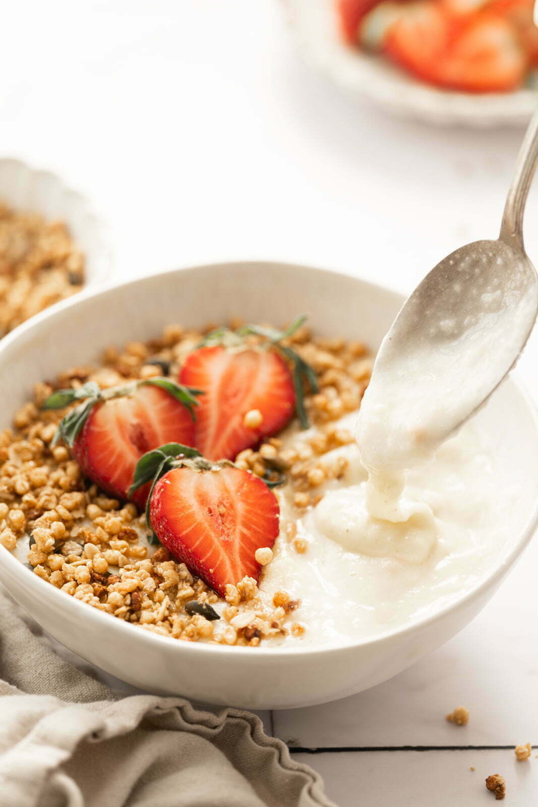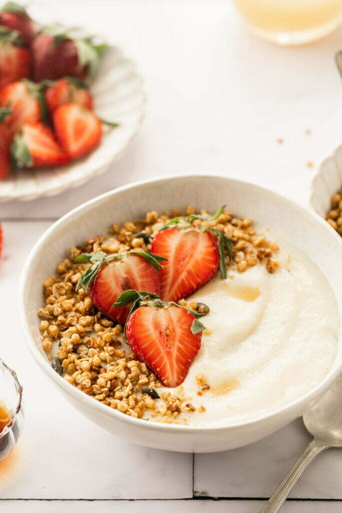 Prelijte v dve skodelici in dodajte dodatke po izbiri (granola, jagode, javorjev sirup).