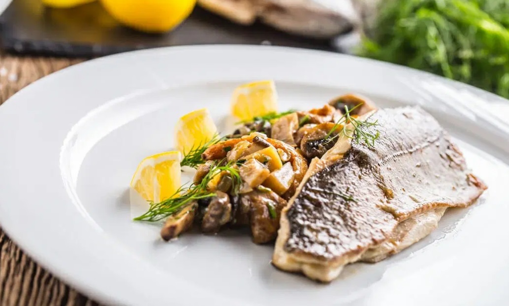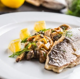 300 g jurčkov 4 fileji postrvi ali dve celi žlica moke sol in poper pol dcl belega vina 2 stroka česna 50g masla timijan, majaron