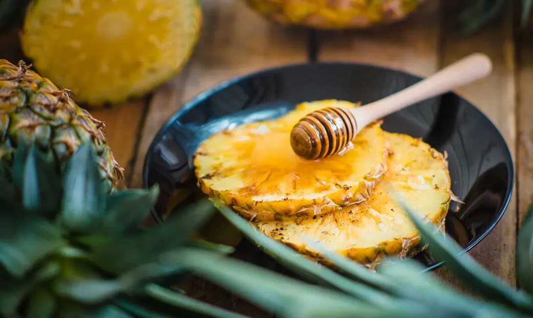4 Pečen ananas prelijte z medeno omako in dobro premešajte, da se omaka enakomerno razporedi po ananasu.