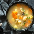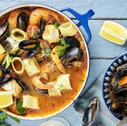 4 Dodamo ribo, školjke in kozice. Lonec pokrijemo in pustimo juho vreti še 10 minut, da se školjke odprejo. Školjke, ki se ne odprejo, zavržemo. Juho nalijemo v skodelice ali krožnike in takoj ponudimo.