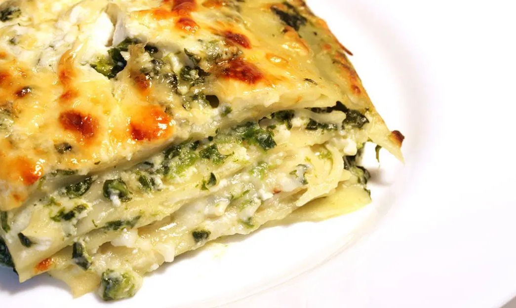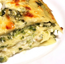 1 Sestavine so za pekač 25 x 35 cm z visokim robom. Špinačo na grobo narežemo, solimo, popramo, dušimo do mehkega, odkrijemo in kuhamo še toliko časa, da voda, ki jo je špinača spustila, povre. Na sredini naredimo malo prostora, dodamo oljčno olje, popražimo nasekljan česen in premešamo s špinačo.
