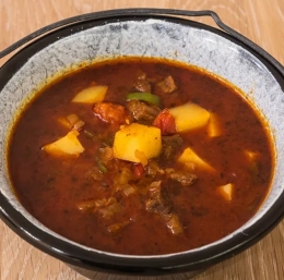400 g govedine 400 g divjačine ( divji prašič, srna) 400 g svinjine 1,2 kg čebule 1,2 kg krompirja 6 strokov česna 1/2 žličke majarona in timijana 2 lovorova lista 1,5 dl belega vina 1,5 dl rdečega vina 0,5 l jušne osnove sol in poper 1 žlica mlete paprike 1/2 žličke pekoče paprike 2 žlici svinjske masti