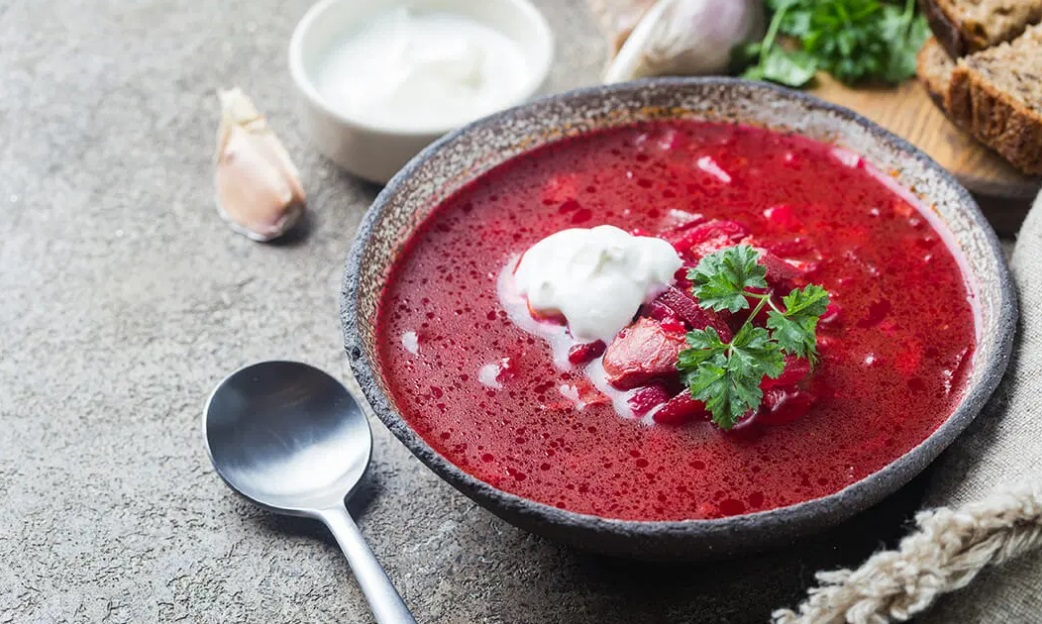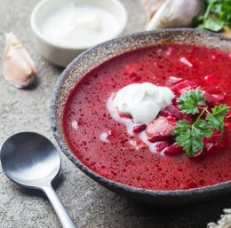 0,75kg rdeče pese 1/2 kilograma zelja 300 g krompirja 125 g paradižnika 1/2 kilograma korenja 1 čebula 1 liter in 1/2 jušne osnove (najbolj zelenjavne) koper (tri, štiri vejice) 2 žlici sladkorja, 2 žlici vinskega kisa peteršilj za dekoracijo 2 ščepa soli, ščep popra