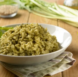 1 Čebulo drobno nasekljamo, jo solimo in popražimo na oljčnem olju, da se razpusti. Dodamo nasekljan česen in pražimo, da zadiši, nato v ponev dodamo riž. Na hitro ga popražimo in zalijemo z tremi zajemalkami vode ali jušne osnove. Solimo in popramo po okusu, po želji dodamo tudi malo čilija.