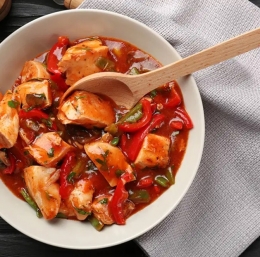 800 g piščančjega mesa brez kože in kosti 4 večje čebule 4 stroke česna 1 rdeča paprika 1 zelena paprika 1 feferon 1 žlička nasekljanega peteršilja sol in poper po okusu 0,3 dl oljčnega olja 300 ml paradižnikove omake 200 ml piščančje jušne osnove 150 ml belega vina
