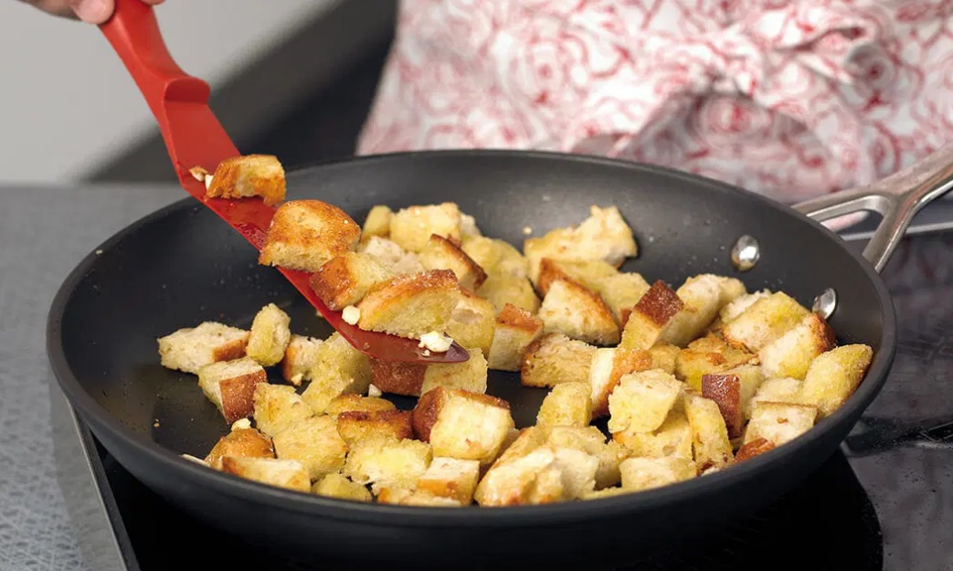 5 Če se nam ne ljubi prižigati pečice, ponev namastimo z žlico olja ali masla in jo segrejemo. Vanjo stresemo pripravljene kruhove kocke, eno plast naenkrat. Ob stalnem mešanju jih pražimo približno 5 minut, da se z vseh strani lepo, hrustljavo zapečejo.