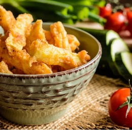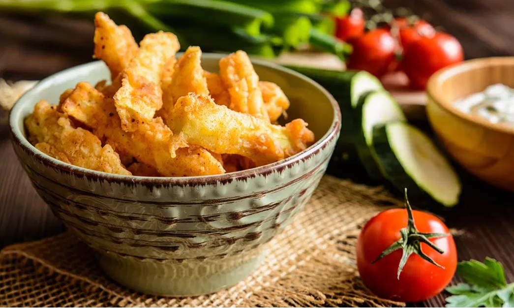 2 Bučke operemo in narežemo na približno en centimeter debele kolobarje, nato pa kolobarje narežemo na palčke. Pomakamo jih v testo (pomagamo si z vilicami) in jih ocvremo v segretem olju, da se lepo zlato-rumeno zapečejo.