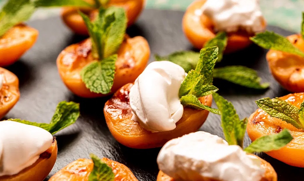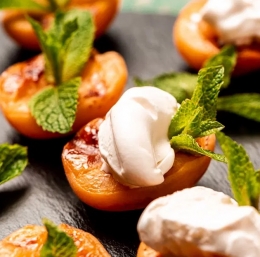 5 Breskve vzamemo z žara, jim dodamo žlico stepene smetane, metin listič in takoj postrežemo.