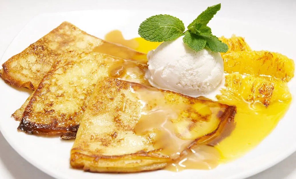 5 Ponovimo postopek z vsemi palačinkami. Ko smo pripravili vse palačinke, jih enakomerno prerazporedimo po ponvi, štiri naenkrat, prelijemo s Cointreau-jem in flambiramo (zažgemo).