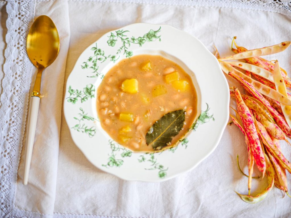 250 g kuhanega fižola 4 krompirji 2 žlice moke 2 žlici kisa 2 žlice maščobe (olje, svinjska mast, maslo) pol srednje velike čebule sol, poper, lovorov list