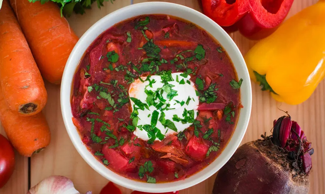 800 g mesa (govedine ali svinjine, lahko tudi s kostmi) 3 krompirje 2 srednje veliki rdeči pesi 3 manjše čebule 5 strokov česna 2 korenčka 1 dl paradižnikove mezge 3 paradižnike po eno manjšo zeleno in rdečo papriko 1 manjšo glavo belega zelja sesekljan peteršilj 1 žlico sesekljanega koprca 2 lovorjeva lista sol in poper po želji 2 žlici olja ali mast
