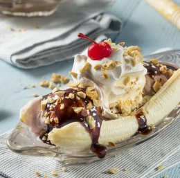 4 Pripravimo si štiri podolgovate skledice, v katerih bomo postregli sladico. Med dve polovici banane položimo po tri kepice sladoleda (po eno kepico vsakega okusa), prelijemo s stopljeno čokolado, okrasimo s stepeno sladko smetano in potresemo s popraženimi lešniki.
