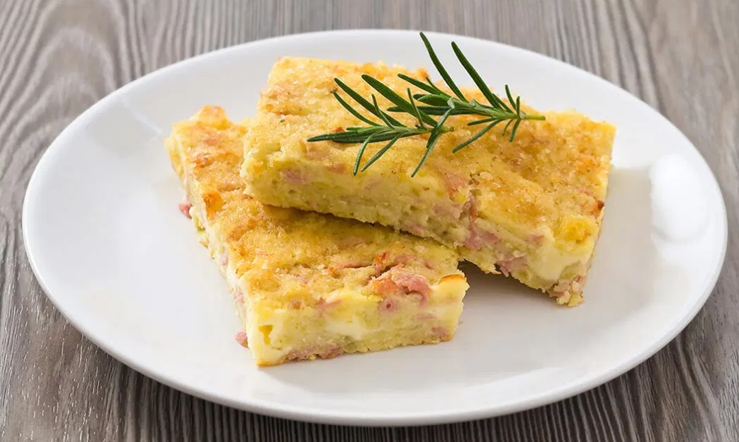 4 Pečico segrejemo na 200° C, pekač namastimo in potresemo z drobtinicami. Polovico krompirjevega testa enakomerno razporedimo po dnu pekača. Potresemo ga z mocarelo in drugo polovico šunke ter prekrijemo s preostalim testom.