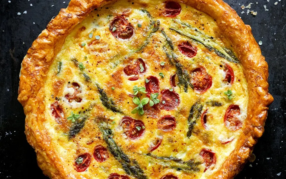 250 g zamrznjenega listnatega testa 300 g divjih špargljev 15 češnjevih paradižnikov 2 jajci 3 dcl smetane za kuhanje 60 g parmezana 120 g mehkega belega sira sol, poper, muškatni orešček vejica svežega majarona in timijana oljčno olje