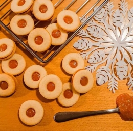6 V lončku segrejemo marmelado, ki smo ji dodali žlico limoninega soka, da dobilo lepo mazljivo zmes. Na vroče piškote (brez luknje) damo žličko marmelade, čez damo obroček, odložimo in počakamo, da se ohladijo.