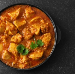 800 g piščanca brez kože 1 žlica oljčnega olja 1 žlica masla 2 dl paradižnikove omake 2 čebuli 1 paprika 3 stroki česna 8 dl tople piščančje osnove 1 dl kisle smetane 1 žlička krompirjevega škroba sol poper 1 žlica mlete rdeče paprike ščepec pekoče paprike 1 žlička kurkume sesekljan svež peteršilj