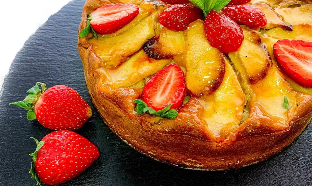 V pekač nalijemo polovico testa in nanj razporedimo polovico jabolčnih krhljev in jagod. Prelijemo z drugo polovico testa in po vrh razporedimo preostala jabolka in jagode.