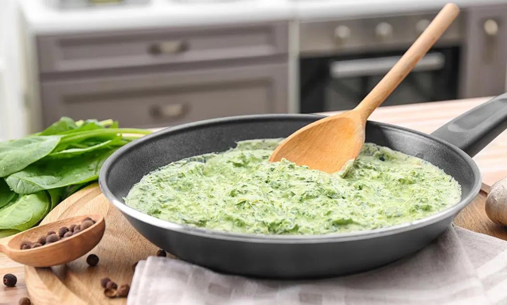 V kozici segrejemo maslo, dodamo žličko moke, ko se zmes speni pa še strok strtega česna in pretlačeno špinačo. Gladko zmešamo, zalijemo z mlekom in juho ter zmešamo z metlico. Prilijemo vodo, v kateri smo špinačo kuhali, po potrebi dosolimo, popramo in dodamo muškatni orešček.