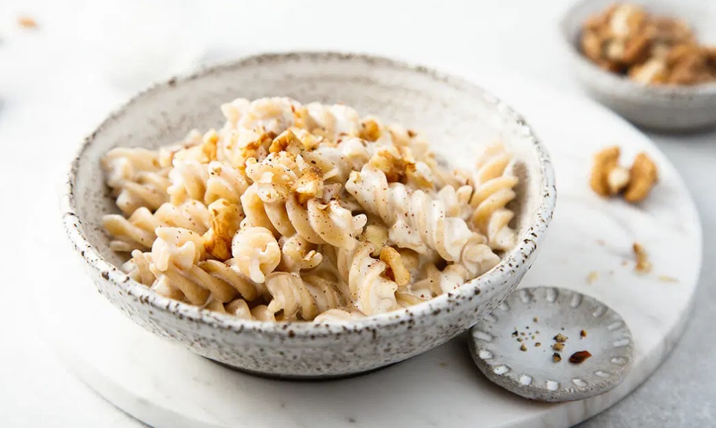 Sesekljamo ali zmeljemo orehe in, če imamo star kruh, naredimo tudi domače drobtine. Dodamo drobno sesekljan česen in svež sir, da nastane gladka zmes. Nato dodamo mleko in oljčno olje ter dobro premešamo. Vmešamo smetano, da nastane gosta omaka. Začinimo s soljo in poprom.