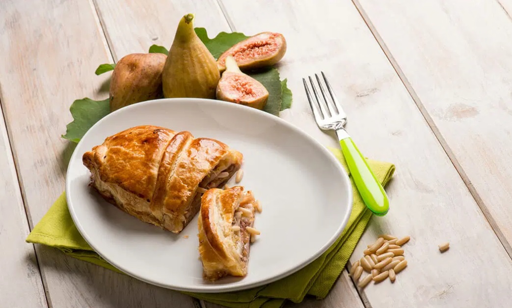 600 g sladkih fig 1 paket (dve kocki) listnatega testa 150 g grobo nasekljanih oreščkov (pinjoli, orehi, lešniki ali mandlji) 1 žlička cimeta majhen ščepec soli 1/2 neškropljene pomaranče – sok in naribana lupinica 2 žlici stopljenega masla (ali oljčnega olja) 1 jajce (za premaz)
