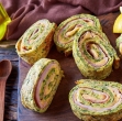 Testo vzamemo iz pečice in s peki papirjem vred preložimo na pult. Testo obložimo s kuhanim pršutom in sirom ter zavijemo v rolado. Trdno zavijemo s peki papirjem, da se nam ne odvije in pustimo, da se ohladi.