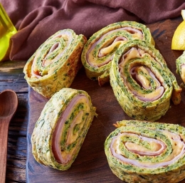 5 jajc 3 bučke 50 g parmezana sol in poper 200 g kuhanega pršuta 200 g sira v rezinah 100 g jogurta sveža zelišča 1 strok česna oljčno olje žlička limoninega soka