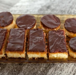 Pečen biskvit ohladite. Prerežite ga na pol. Spodnjo polovico biskvita vrnite v pekač. Premažite ga z marmelado. Če je marmelada pretrda za mazanje, jo segrejte v vodni kopeli ali v mikrovalovni pečici.
