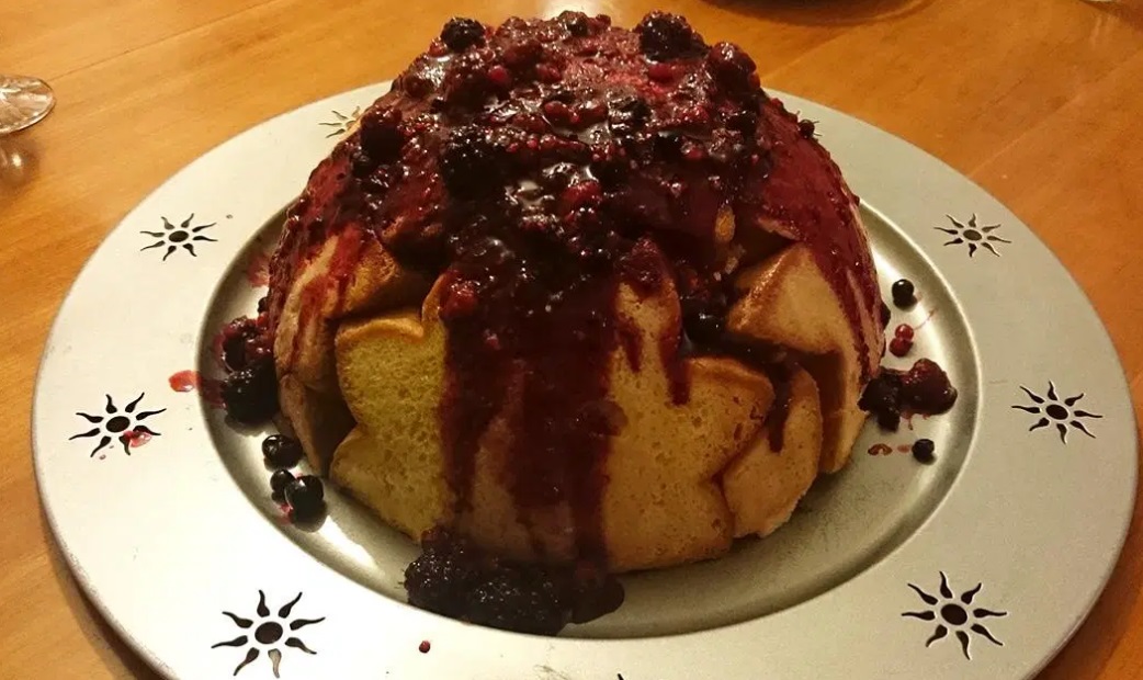 1 panetone brez sadja – pandoro 1 l sladke smetane 2 vrečki kreme pasticcere ali vaniljevega pudinga galeta 1 dl mleka 2 kremfixa 2 žlici sladkorja 500 g zmrznjenega ribeza 1/2 l jagodnega soka