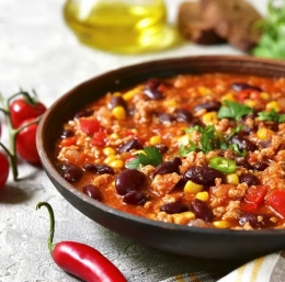 250 g rdečega fižola 1,5 l mesne juhe 1 čebula strok česna 2 jedilni žlici topljenega masla 500 g mlete govedine konzerva koruze sol poper 1 čajna žlica čilija v prahu 1 jedilna žlica sladke paprike v prahu 250 g paradižnikov (iz pločevinke) 1/2 jedilne žlice jedilnega škroba