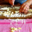 Vzhajano testo razvaljamo v 1 cm debelo pravokotno krpo, ki jo enakoreno premažemo z nadevom.