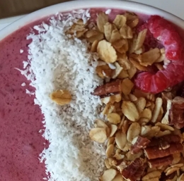 Ko je sadje gladko zmleto, ga prelijemo v skodelice, posujemo z domačo granolo (recept najdete v zavihku sladice), okrasimo s kokosovimi kosmiči in z nekaj zmrznjenih malin.
