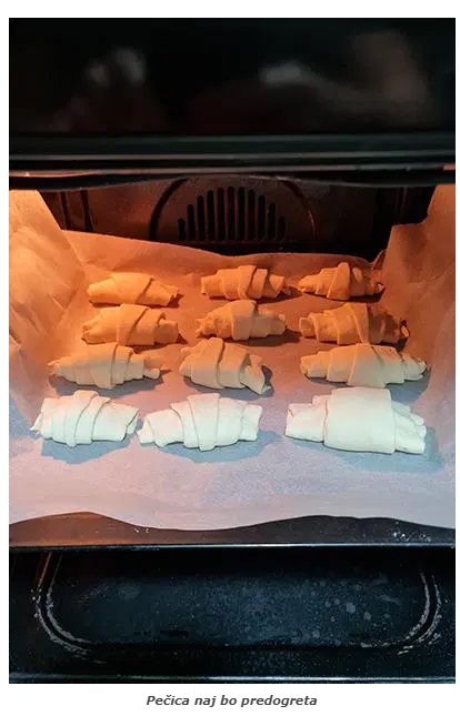 Na širši del položimo žličko izbranega nadeva in enega po enega položimo na pekač, ki smo ga predhodno obložili s peki papirjem. Med rogljički mora biti dovolj prostora, ker bodo čez noč malo narasli.