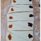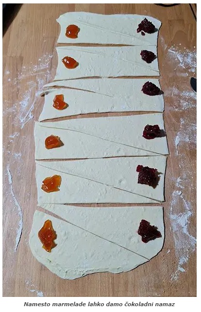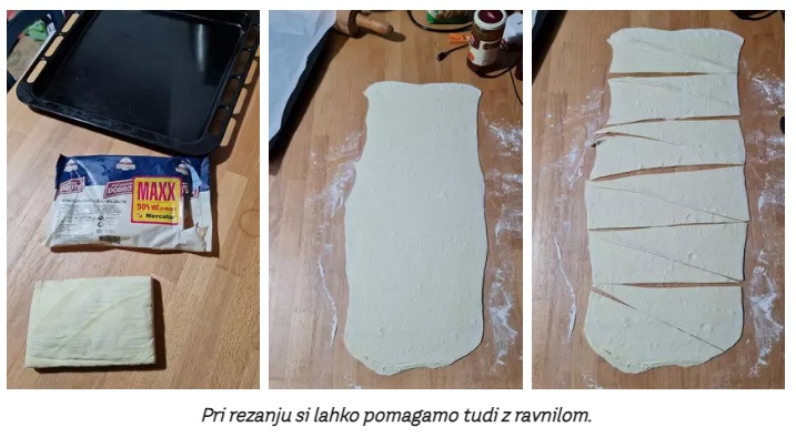 Zvečer vzamemo testo iz hladilnika in ga pustimo počivati 10 minut. Rahlo pomokamo delovno površino in testo razvaljamo na približno 25 x 75 cm pravokotnik. Narežemo ga na trikotnike.