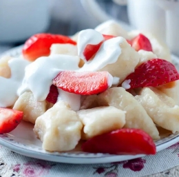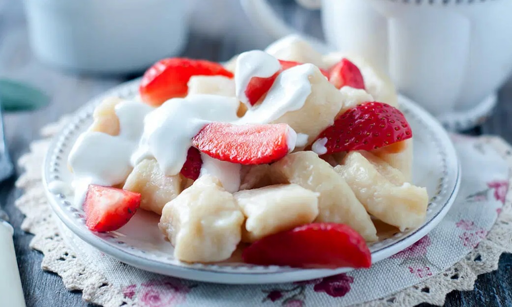 Jagode operemo, očistimo in narežemo. Na krožnik postavimo nekaj njokov, dodamo jagode, kislo smetano in vse, če imamo radi bolj sladko, še nekoliko posladkamo.