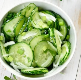 Kumare olupimo, razrežemo na polovice in z žličko izdolbemo semena. Če so mlade, lahko semena pustimo in jih samo narežemo na tanjše rezine. Čebulo olupimo in narežemo na lističe.