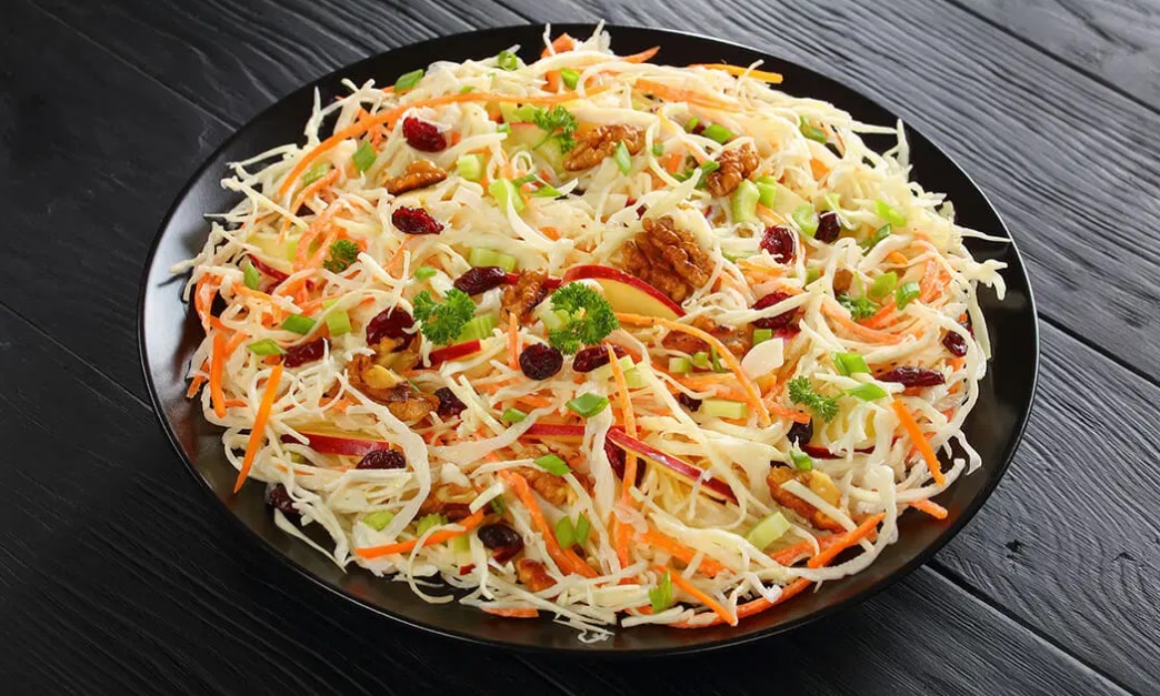 V veliki posodi zmešamo korenje, zelje, jabolko, ki ga narežemo na tanke rezine, orehe in čebulo.